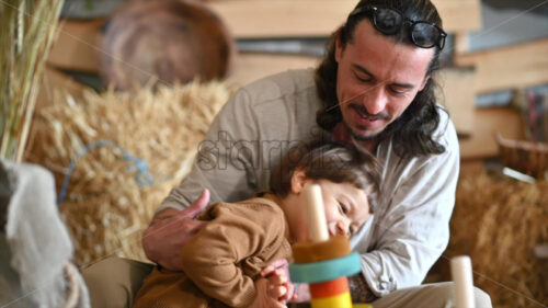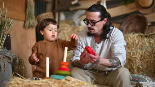 Video – Father playing with his son with colourful, ecological wooden toys in a barn, near square hay bales