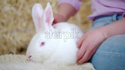 Camera filming a woman petting a white bunny in the barn near square hay bales Royalty Free Stock Video Footage Royalty Free Stock Video Footage