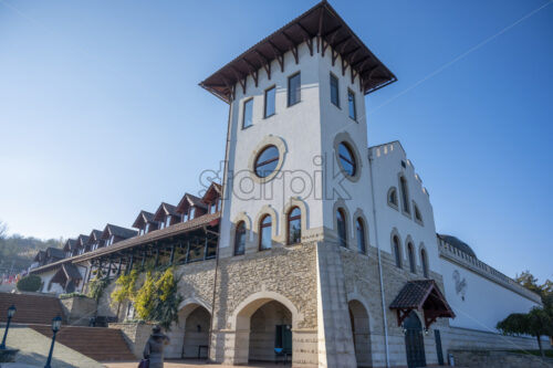 Purcari Winery main building made in old style. Walking paths and stairs in front of it. Walking woman. Good weather in Moldova