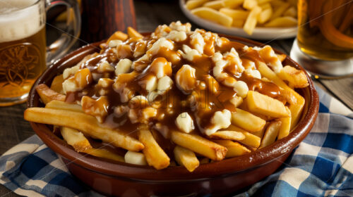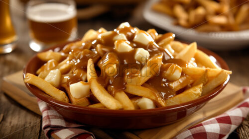 Iconic Canadian Poutine, rench fries, cheese curds, and gravy, presented in a rustic dish,.