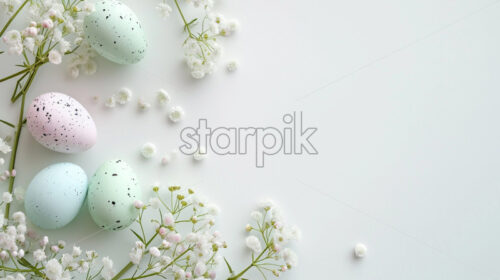 Easter postcard with pastel-colored easter eggs surrounded by cherry blossoms