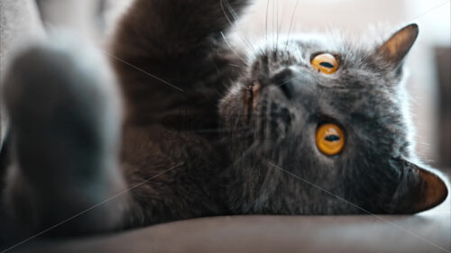 Video – Close up of a Scottish Fold cat with orange eyes sitting on the ground in a garden