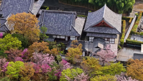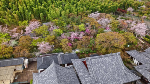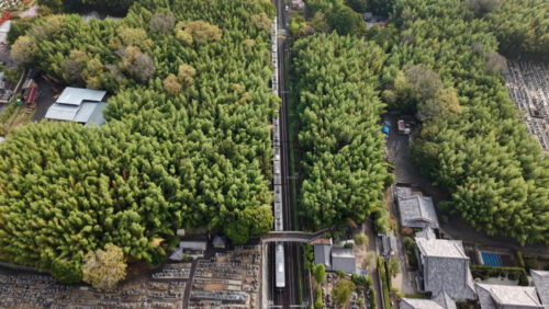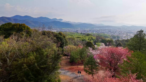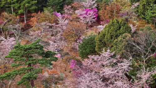 Video – Close up of a grey and white cat sitting calmly on a stone path with soft green background