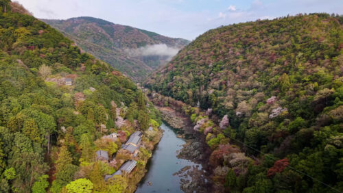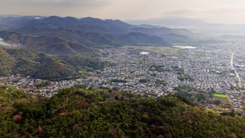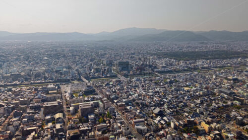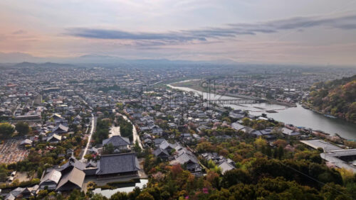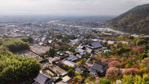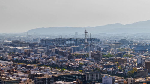 A man stand-up paddleboarding on tranquil blue water near a coastal town, framed by blurred umbrellas in the foreground Royalty Free Stock Video Footage
