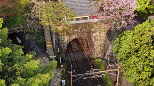 Rear view of a beige baby stroller moving along a narrow alley with yellow and brown walls Royalty Free Stock Video Footage