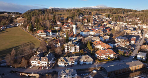 Video – Aerial drone view of a village. View of multiple residential buildings, country roads, bare trees and football field. Sunny weather. Moldova