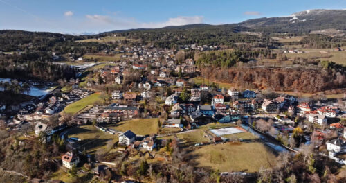 Video – Aerial drone view of a village. View of multiple residential buildings, country roads, bare trees and football field. City on the background. Sunny weather. Moldova