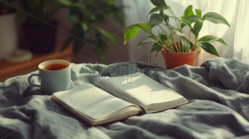 a book on a cosy bed with a cup of coffee, morning leisure time