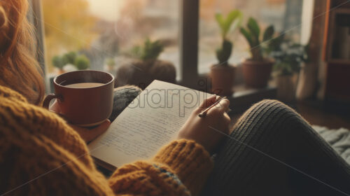woman enjoying relaxing time in bed with a notes book and coffee