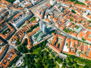 Video – Aerial drone view of the iconic spiral tower of the Church of Our Saviour in Copenhagen, Denmark