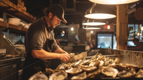 A skilled scallop preparer in a lively seafood market as they delicately clean and prepare fresh scallops.