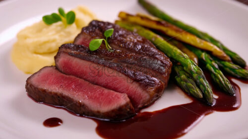 Close up of a gourmet meat dish served with sauce, greens, and rosemary garnish on a white plate Royalty Free Stock Video Footage