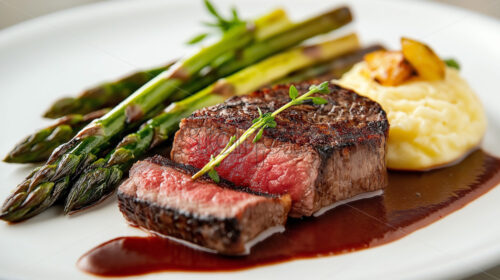 Video – Close up of a gourmet meat dish served with sauce, greens, and rosemary garnish on a white plate