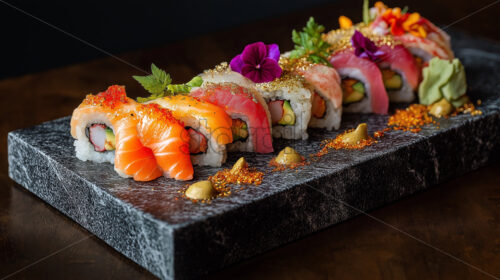 Close up of vibrant red sushi rolls topped with creamy sauce and sesame seeds, served on a ceramic plate Royalty Free Stock Video Footage