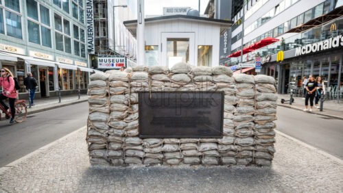 Video – Antibes, France – September 4, 2025: Aerial drone view of the bronze sculpture Le Nomade along the ramparts with waves crashing on the rocks below