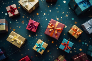 Video – Traditional wooden Christmas pyramid against a clear blue sky with levels representing nativity scenes at a Christmas market in France. Vertical