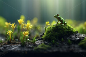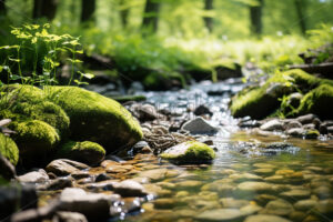 Video – Close up of a grey and white cat sitting calmly on a stone path with soft green background