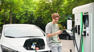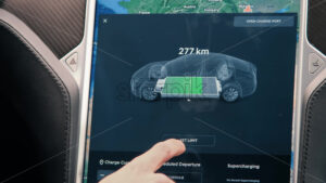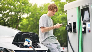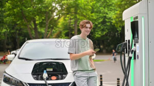 Electric vehicle plugged into charging port in daylight Royalty Free Stock Video Footage
