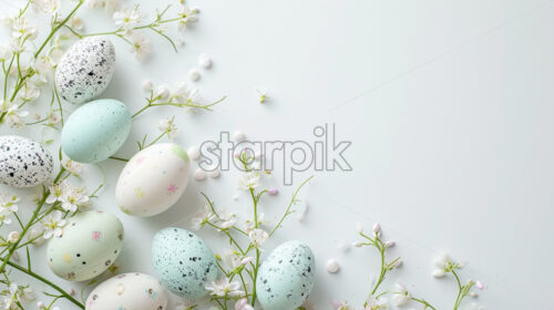 Easter postcard with pastel-colored easter eggs surrounded by cherry blossoms
