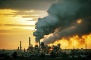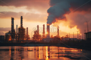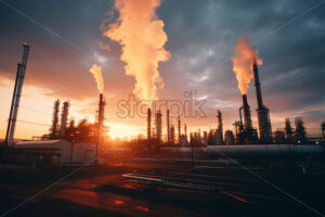 Plastic garbage on a conveyor belt at waste recycling factory. Workers on the background