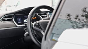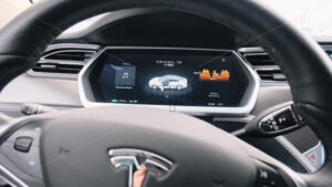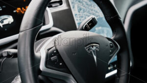 Video – Close up of an electric car plugged into a blue charging cable in daylight