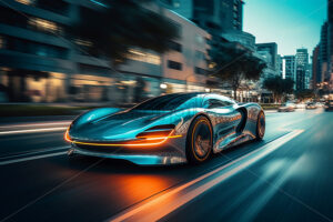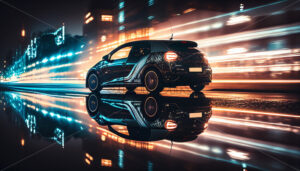 Video – Close up of a sleek black and green electric car charging station, its neon lit rim glowing in the dusk