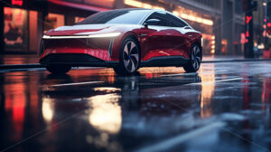 Video – Close up of a pink, electric car charging outdoors under rain