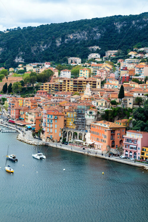 Beaulieu-sur-Mer, France – July 5, 2024: Boats docked in the port with the mountains on the background. Vertical Royalty Free Stock Video Footage