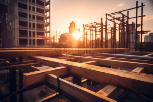 Video – City skyline with construction crane and red white chimney in soft evening light