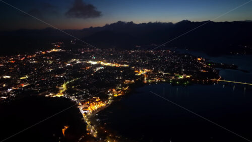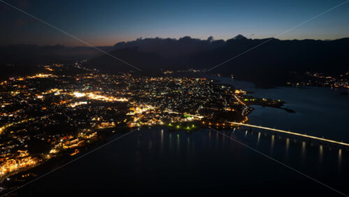 video Aerial drone view of Lake Kawaguchiko near the Fujikawaguchiko town, Japan at night Royalty Free Stock Video Footage