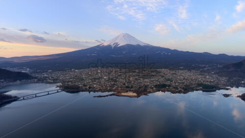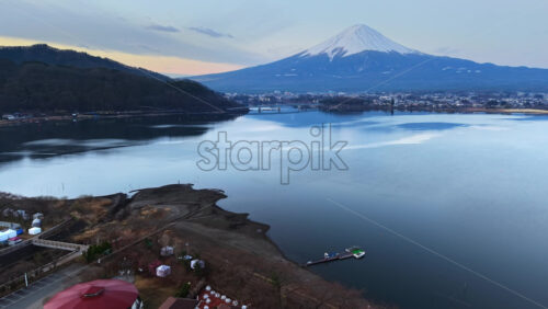 video Aerial drone view of Lake Kawaguchiko near the Fujikawaguchiko town, Japan with Mount Fuji on the background in the evening Royalty Free Stock Video Footage