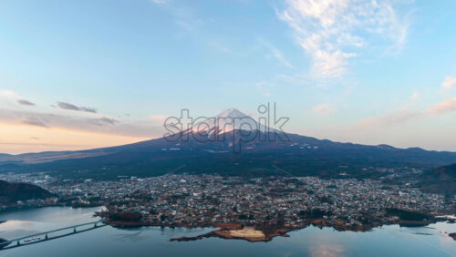 video Aerial drone view of Lake Kawaguchiko near the Fujikawaguchiko town, Japan in the evening time lapse Royalty Free Stock Video Footage