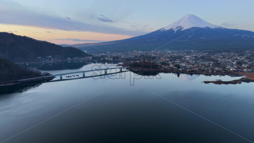 Video Aerial drone view of Lake Kawaguchiko near the Fujikawaguchiko town, Japan at sunset