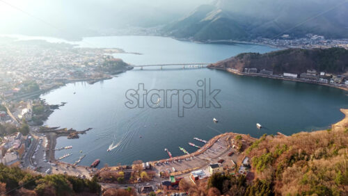 video Aerial drone view of boats moving on Lake Kawaguchiko near the Fujikawaguchiko town, Japan Royalty Free Stock Video Footage