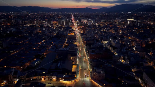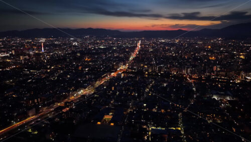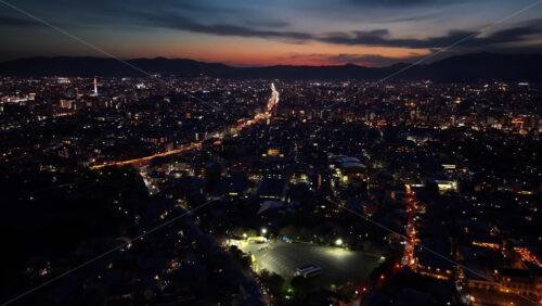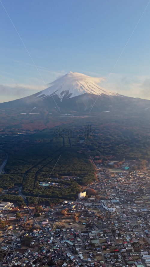 The sun sets over a coastal town with trees, hills, and buildings reflected on the golden sea. Vertical Royalty Free Stock Video Footage