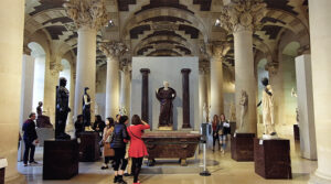 Video – Cannes, France – October 31, 2025: A person wearing a wide grinning clown mask, raises their hands playfully, holding an orange pumpkin shaped bucket near children in skeleton costumes on Halloween