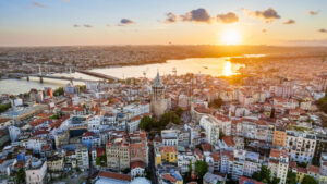 Aerial drone view of Istanbul at sunset, Turkey. Multiple residential buildings around the Galata tower, Golden Horn waterway on the background