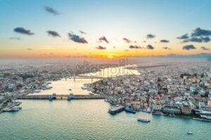 Aerial drone view of Istanbul at sunset, Turkey. Multiple residential buildings, mosques, Galata and Metro bridges over the Golden Horn waterway with floating ships