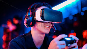 Video – Young girl sitting on the bed at night, using virtual reality headset. Neon colorful lights