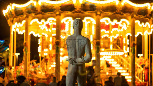 Video – Aerial drone view of a coastal promenade lined with palm trees and public art sculptures, with people strolling near the Mediterranean Sea, Antibes, France