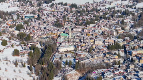 Video – Aerial drone view of a cemetery in Chisinau, Moldova. Multiple graves, crypts, walkways. Cityscape on the background. Cloudy weather, bare trees, winter