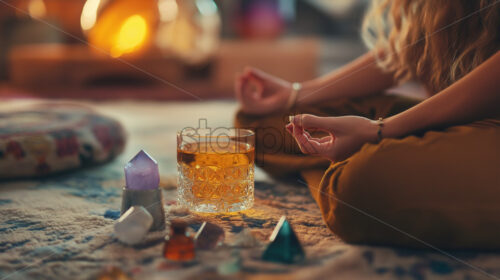 A young caucasian smiling woman is sitting on the bed and doing skin care, mirror and skin care products nearby
