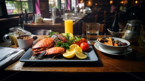 Video – Fresh seafood platter with smoked salmon slices, shrimp, olives, and pate served with lemon and dill garnish