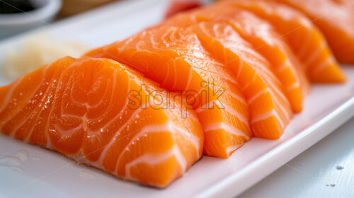 Video – Close up of triangle shaped salmon sushi on a platter with wasabi and gari