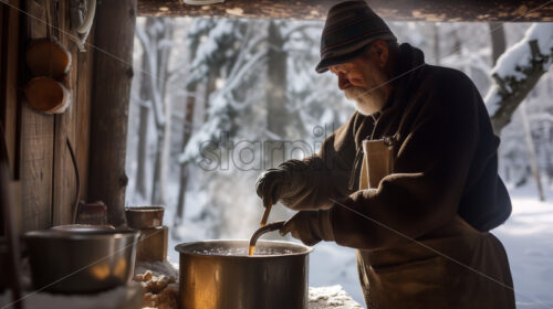 Siberian nomad with a fur-lined attire and traditional crafts in Siberian wilderness.