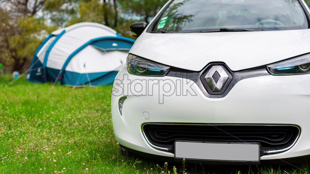СHISINAU, MOLDOVA – APRIL 30, 2021: Parked electric car with a tent for camping on a clearing in the forest
