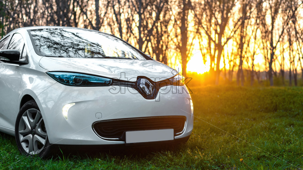 Home » Shop » photo » СHISINAU, MOLDOVA – APRIL 30, 2021: Parked electric white car in the nature, green lawn, trees, sunset