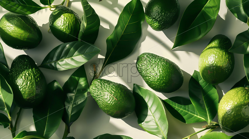 A background with avocado fruits and leaves