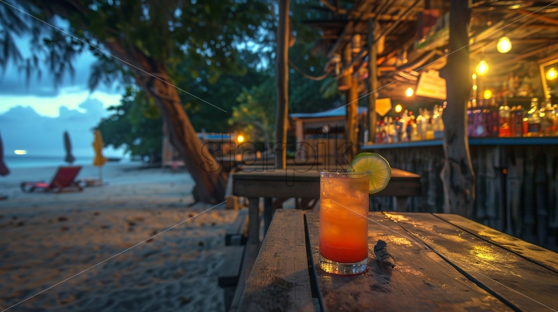 Red cocktail with orange slice on a table by the blue green sea video Royalty Free Stock Video Footage