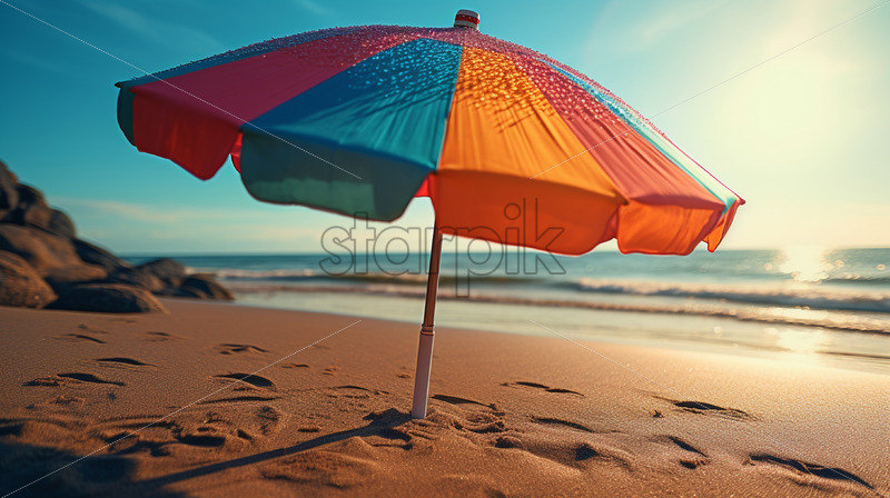 Daylight view to beige sun chairs and sunshades. People walking on background. Cloudy sky and mountains on background. Negative copy space, place for text. Forte dei Marmi, Italy